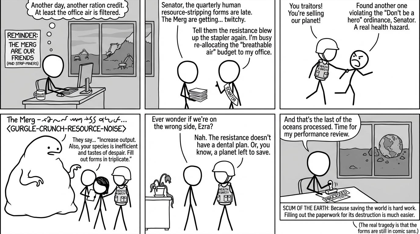 The narrative follows Ezra Barker, a man who has secured a relatively comfortable existence by working for the invaders. While most of humanity suffers, Ezra holds an office job within the puppet government, assisting “The Senator,” a human ruler appointed by the aliens to manage the territory. Ezra’s life is one of administrative complicity; he helps manage the logistics of the occupation, ensuring the resource extraction continues smoothly. However, the fragile safety of the collaborators is threatened by a persistent human resistance movement that refuses to surrender, as well as the inherent brutality of the Merg themselves.