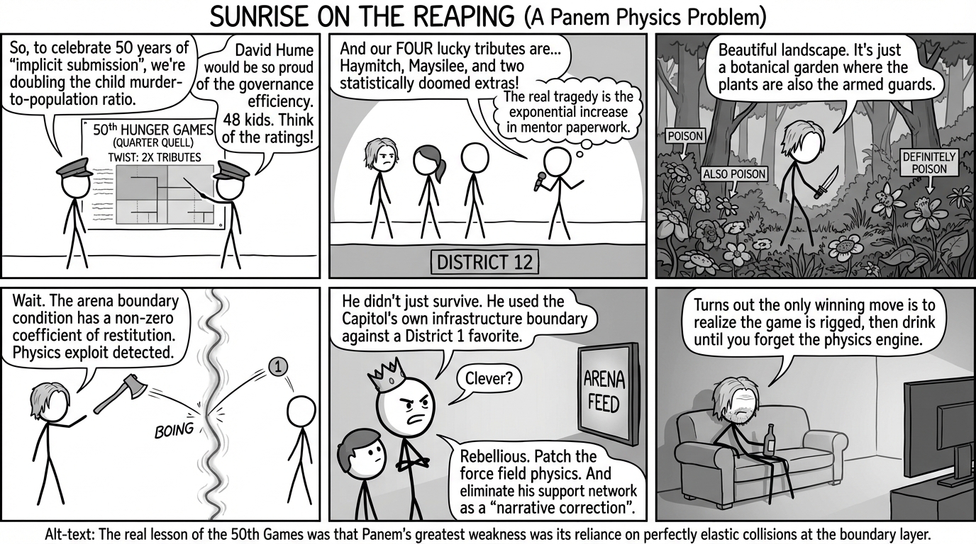Author Suzanne Collins has stated that the thematic foundation of Sunrise on the Reaping is inspired by Scottish philosopher David Hume, specifically his ideas regarding implicit submission. The text explores “the easiness with which the many are governed by the few,” examining how the Capitol maintains control over the districts not just through physical force, but through the psychological acquiescence of the population.