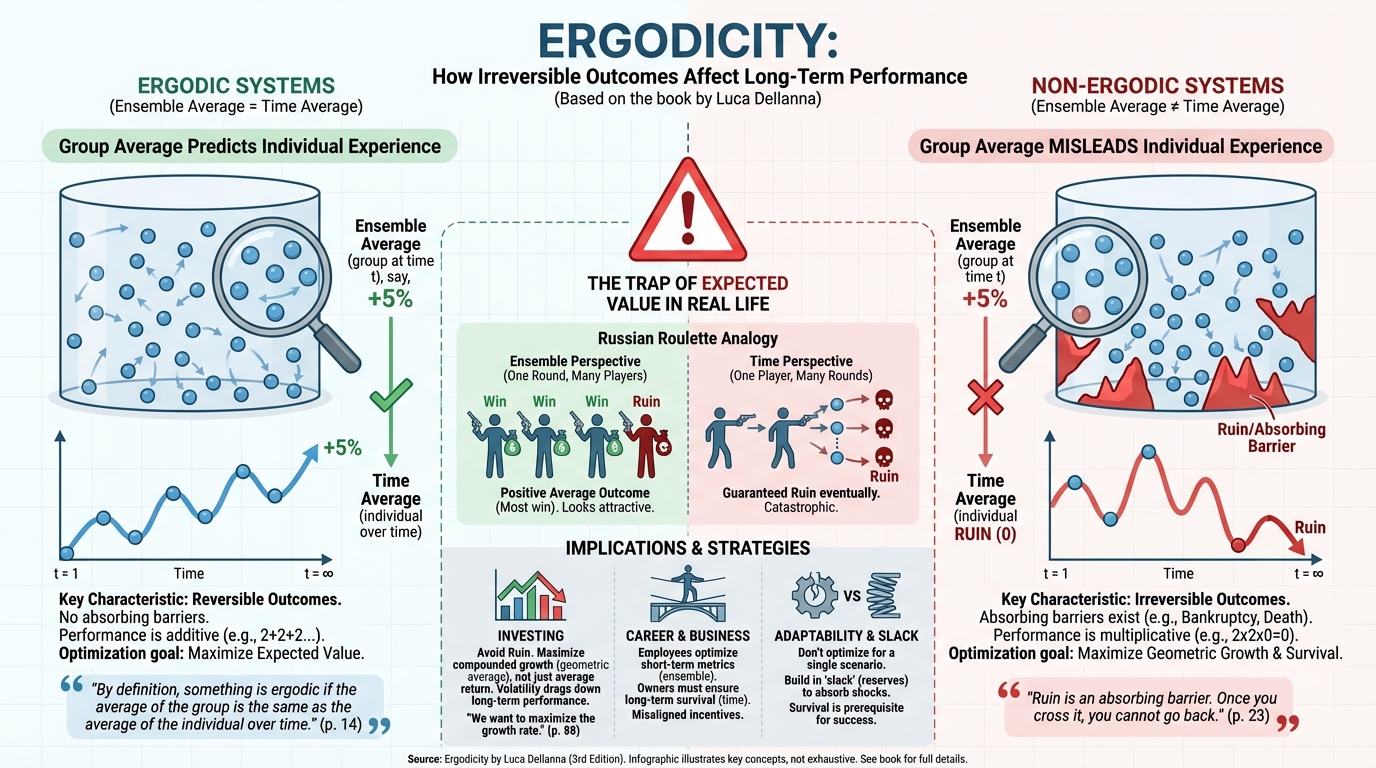 The central thesis of the book defines ergodicity through the relationship between ensemble averages (the average outcome of a group at a specific point in time) and time averages (the average outcome of a single individual over a long period). A system is ergodic only if these two averages are identical. Dellanna argues that most human endeavors—investing, careers, and health—are non-ergodic, meaning the group average does not predict the individual’s long-term experience.
