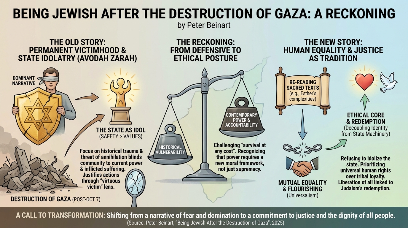 Peter Beinart’s “Being Jewish After the Destruction of Gaza” concludes with a vision for a transformed Jewish identity. He asserts that the current path—defined by an indefinite occupation and the rationalization of mass suffering—is unsustainable both politically and spiritually. The “reckoning” he calls for is a decoupling of Jewish identity from the machinery of the state. He envisions a future where Jews define themselves not by their ability to dominate a specific territory, but by their commitment to the flourishing of all people, implying that the liberation of Palestinians is inextricably linked to the redemption of Judaism itself [2] [3].