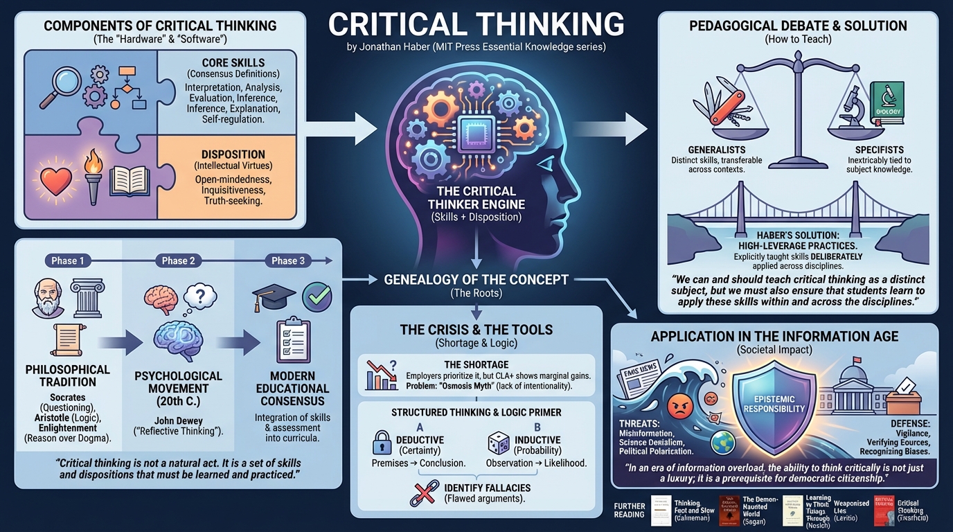Critical Thinking by Jonathan Haber (MIT Press Essential Knowledge series) provides a comprehensive overview of the history, definition, and application of critical thinking. The book examines how the concept evolved from ancient philosophy to modern educational psychology and analyzes the current state of critical thinking instruction in schools and universities. Haber argues for the necessity of structured critical thinking education to combat misinformation and political polarization.