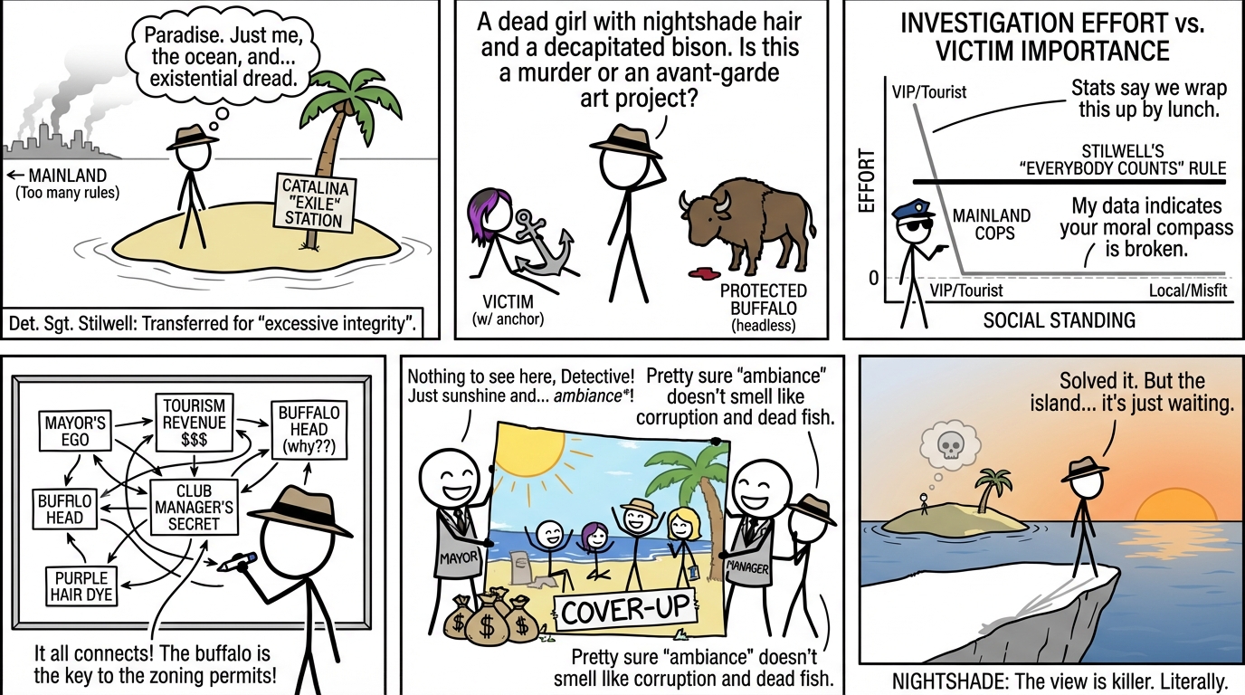 The narrative centers on Detective Sergeant Stilwell, a homicide detective who has been “exiled” to the Catalina Sheriff’s station following a professional fallout with a colleague on the mainland. Stilwell’s hope for a quiet tenure is shattered by two disturbing events: the discovery of a young woman’s body in Avalon Bay and the bizarre beheading of a protected buffalo.