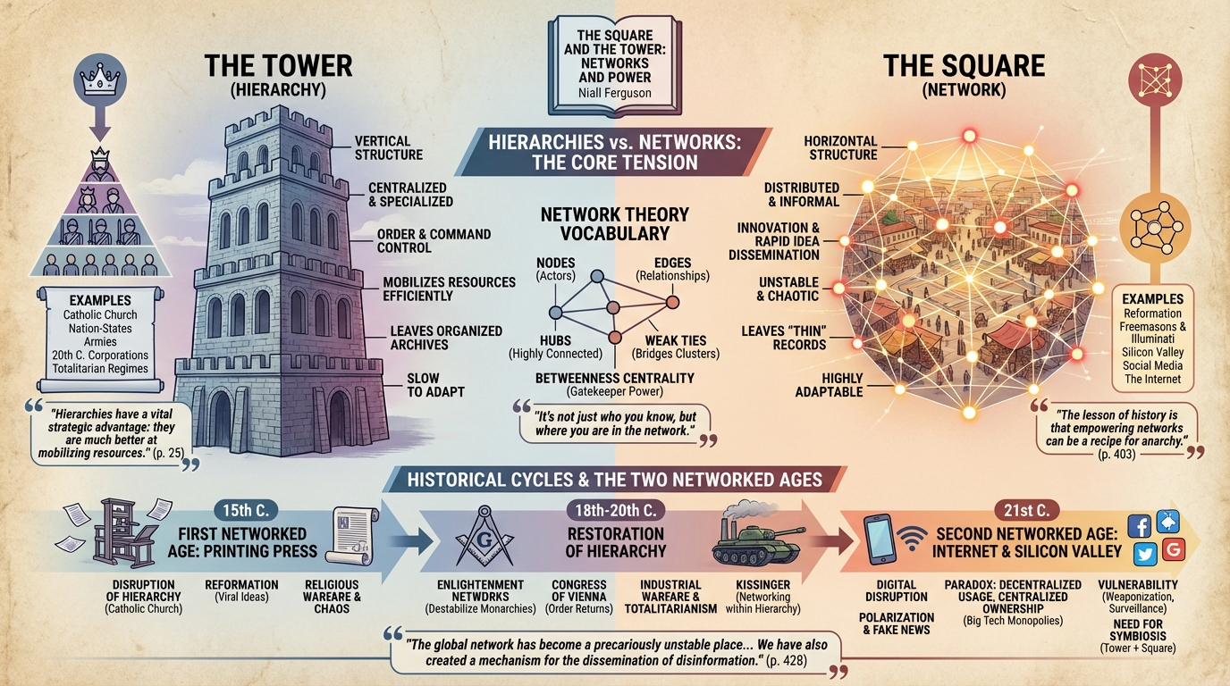 - Niall Ferguson argues that human history is defined by the tension between two organizational forms: the hierarchy (the “Tower”) and the network (the “Square”).