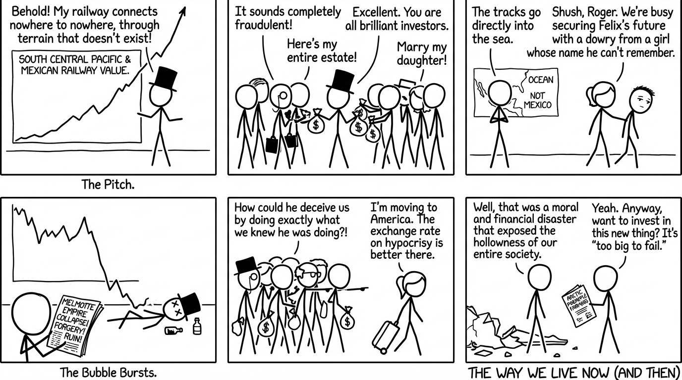 “The Way We Live Now” is a satirical novel by Anthony Trollope, first published in serial form between 1874 and 1875. Written shortly after Trollope’s return to England from abroad, the novel was born out of the author’s indignation at what he perceived as the moral decline of Victorian society. It serves as a scathing critique of the commercial profligacy and dishonesty that characterized the era’s financial and social interactions [1]. Often regarded as Trollope’s masterpiece, the work captures a specific historical moment dominated by speculative bubbles and the erosion of traditional values in favor of wealth and status [2].