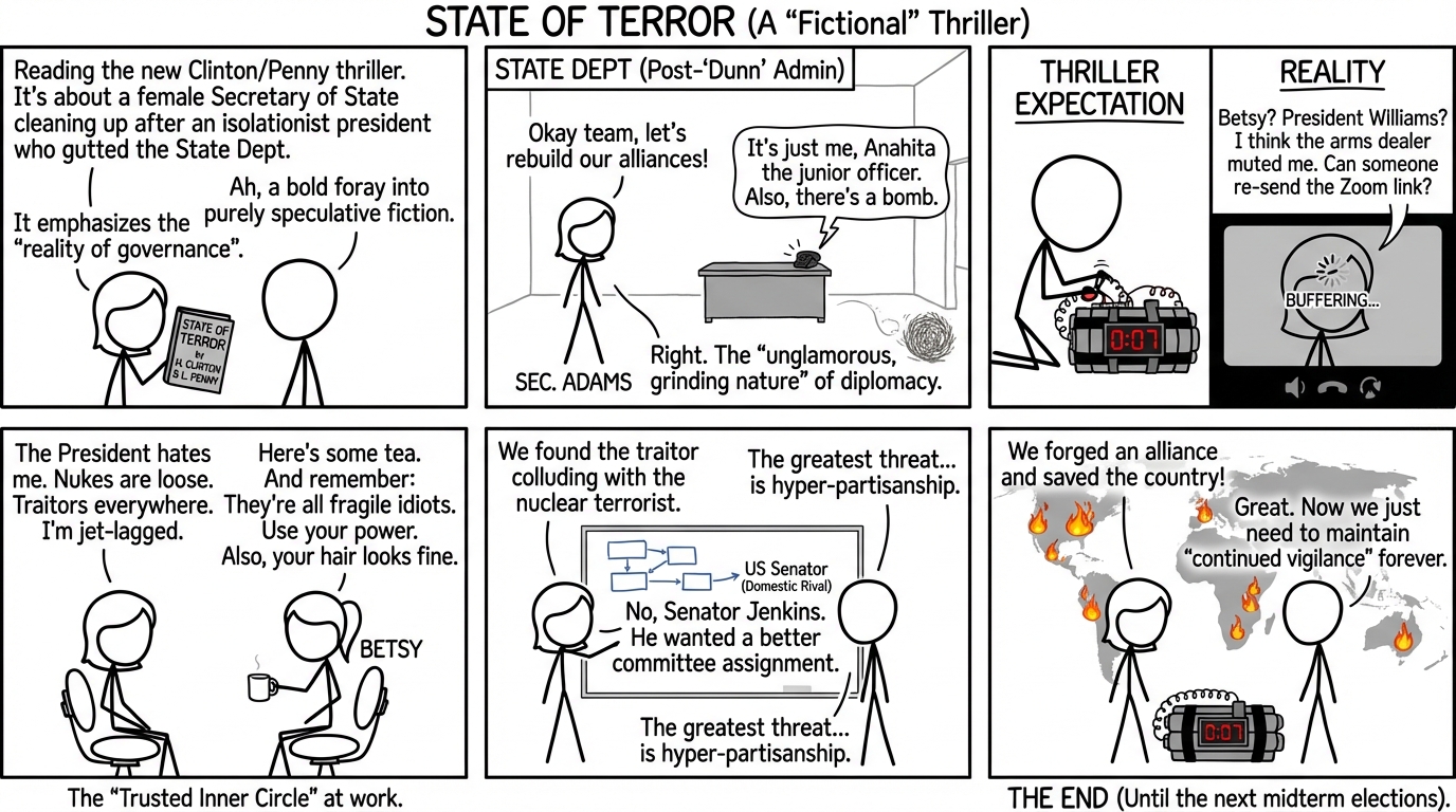 Clinton and Penny emphasize the unglamorous, grinding nature of high-level diplomacy. Unlike thrillers that rely solely on action heroes, State of Terror focuses on the logistical nightmares, jet lag, and intricate protocol involved in international relations.