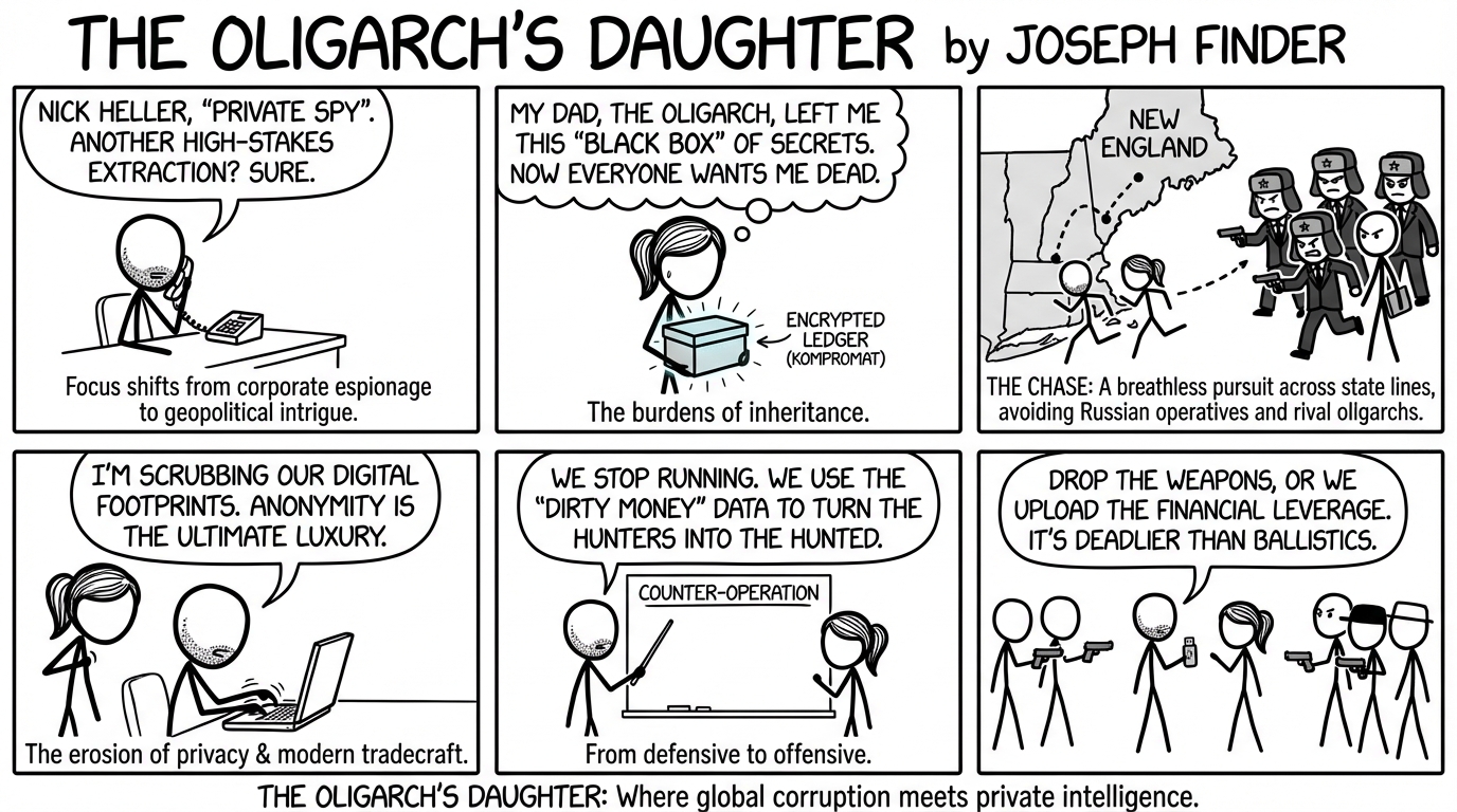The Oligarch’s Daughter, the fifth installment in the Nick Heller series by Joseph Finder, marks the return of the Boston-based “private spy.” Published by HarperCollins, the novel shifts focus from the corporate espionage typical of previous entries toward geopolitical intrigue, centering on the collision between American private interests and Russian organized crime.