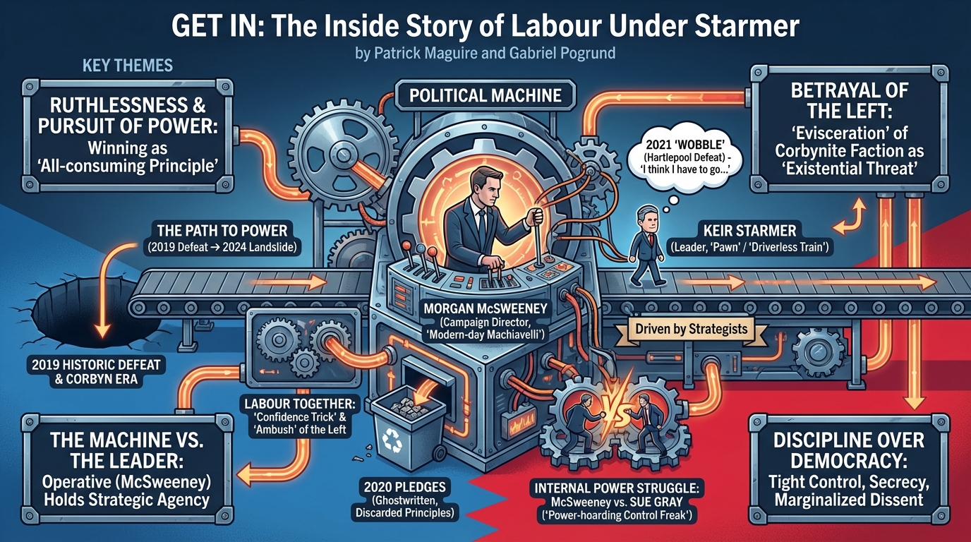 Get In: The Inside Story of Labour Under Starmer, co-authored by Patrick Maguire and Gabriel Pogrund, offers a definitive, behind-the-scenes account of the Labour Party’s transformation from its historic defeat in 2019 to its landslide election victory in 2024. The narrative focuses less on Keir Starmer himself and more on the machinery and operatives behind him, particularly his chief of staff and campaign director, Morgan McSweeney [1]. The book portrays McSweeney as the central protagonist and a “modern-day Machiavelli” who orchestrated a ruthless and disciplined operation to rebuild the party as a merciless vote-winning machine [1]. It argues that this period marks a shift from the “Blair/Brown” era, where leaders drove strategy, to a new model where the political machine drives the leader [1].
