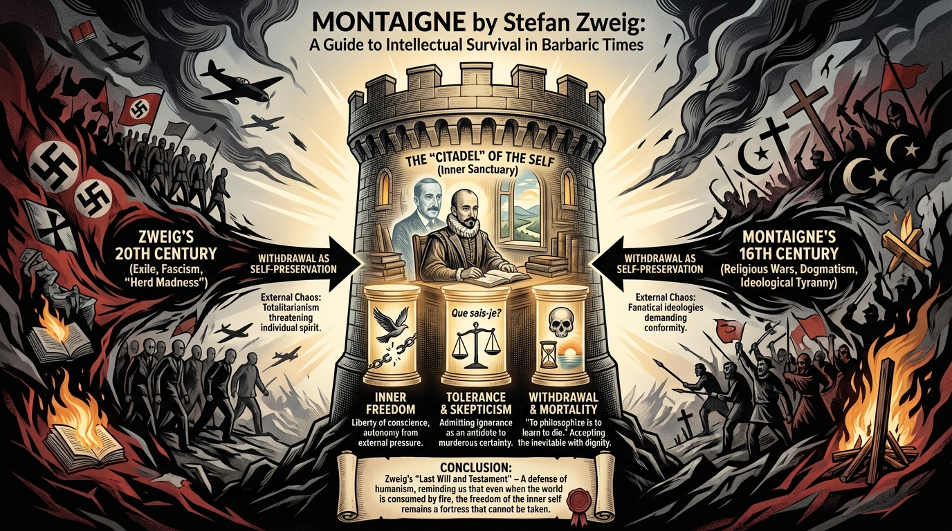 Stefan Zweig’s Montaigne is a biography written under extraordinary circumstances. Drafted in Brazil during the final months of Zweig’s life (1941–1942), the work is as much a reflection on the author’s own era as it is a study of the 16th-century French philosopher. Zweig, a Jewish intellectual in exile from Nazi-occupied Europe, discovered a profound kinship with Michel de Montaigne, seeing him not merely as a historical subject but as a “soul brother” and a guide for survival in barbaric times [1]. This book, which remains an unfinished fragment due to Zweig’s suicide, is less a traditional linear biography and more a personal meditation on how to maintain intellectual integrity when the world descends into madness. It stands as a testament to the enduring power of humanism and the sanctuary of the individual mind.