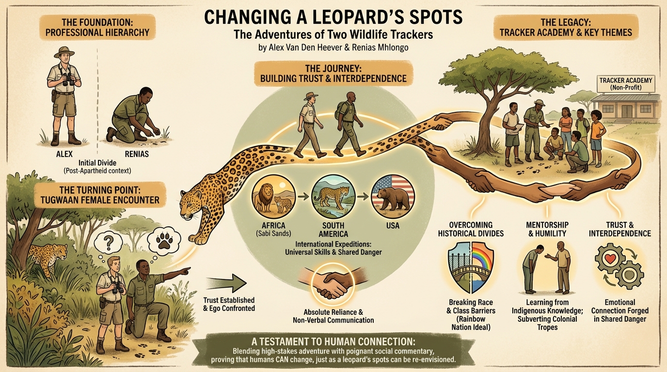 “Changing a Leopard’s Spots: The Adventures of Two Wildlife Trackers” is a non-fiction memoir co-authored by Alex Van Den Heever and Renias Mhlongo. The book chronicles the remarkable three-decade partnership between two men from vastly different backgrounds—Van Den Heever, a white South African game ranger, and Mhlongo, a legendary Shangaan tracker [1]. Set against the stunning backdrop of the Londolozi Game Reserve in the Sabi Sands, South Africa, the narrative transcends a simple collection of bush stories to become a profound exploration of cross-cultural friendship, trust, and the healing of historical wounds in post-Apartheid South Africa [3].