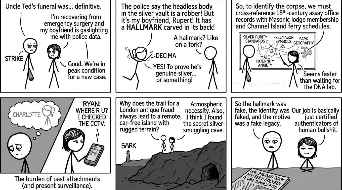 “The Hallmarked Man” is a dense, atmospheric addition to the Strike series, blending a complex whodunit with intense character study. By weaving the technical history of silver hallmarks and the lore of Freemasonry into a modern investigation, Galbraith creates a rich backdrop for a story that is ultimately about the painful process of distinguishing the genuine from the fake, both in artifacts and in people.