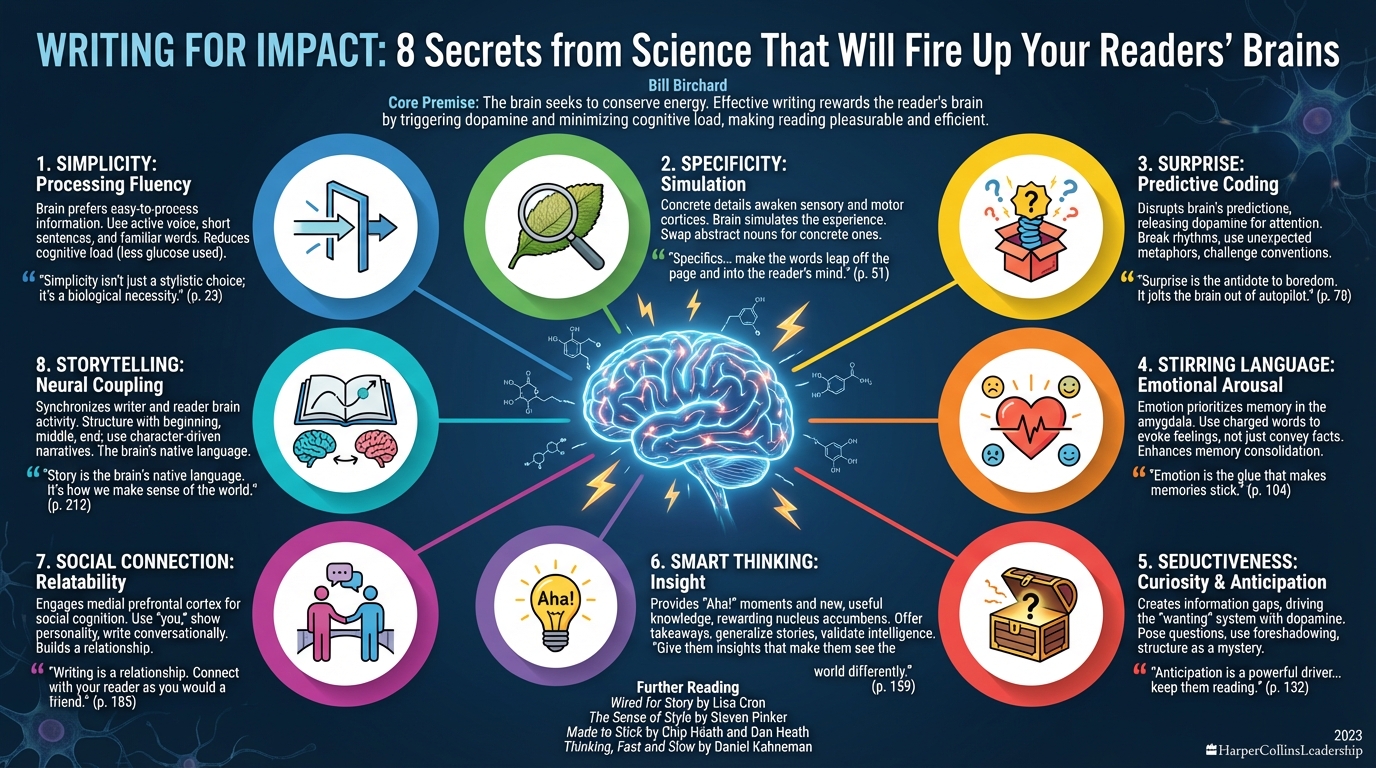 Writing for Impact: 8 Secrets from Science That Will Fire Up Your Readers’ Brains by Bill Birchard (HarperCollins Leadership, 2023) examines the intersection of neuroscience and writing. Birchard, a business journalist and writing coach, posits that successful writing is not merely a matter of artistic style or grammatical adherence, but rather an engagement with the biological processes of the human brain. The book structures its advice around eight “secrets”—all beginning with the letter ‘S’—that correspond to specific neural responses and reward circuits.