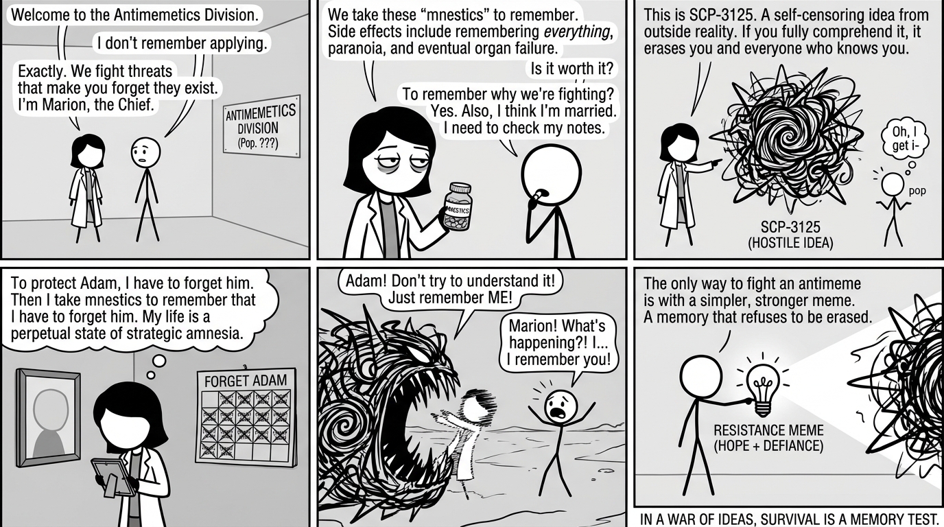Adam Wheeler serves as the emotional anchor of the story and the vessel for the reader’s perspective in the latter half of the book. Initially an outsider unaware of his wife’s true occupation, he becomes central to the resolution. Following Marion’s eventual demise—a sacrifice made to land a blow against SCP-3125—Adam must navigate a world altered by the entity. His development transitions from confusion to acceptance of a burden he did not ask for. The story concludes not with a traditional victory of firepower, but with an ideological one: the synthesis of a meme (an idea) capable of neutralizing the antimeme.