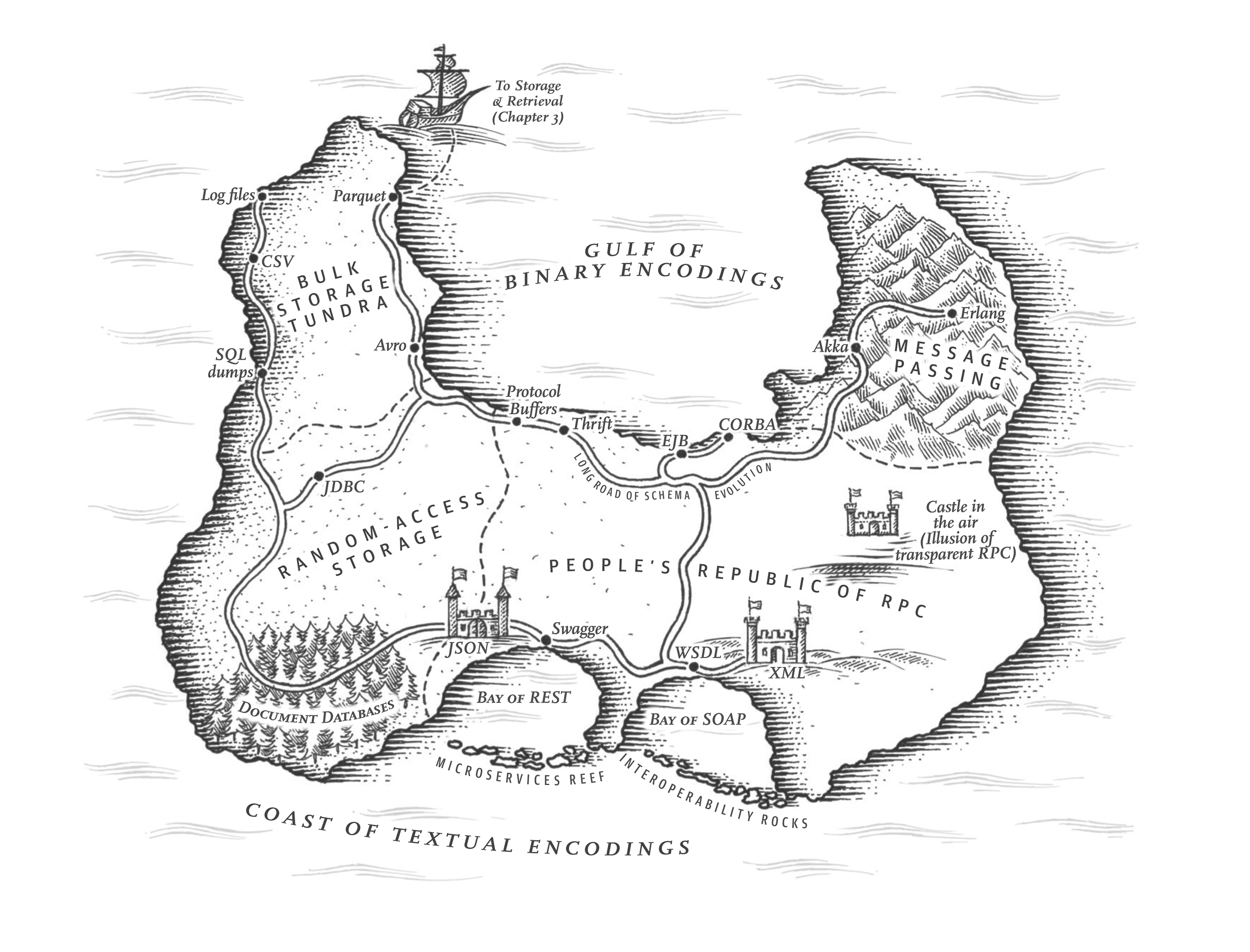 This chapter introduces the concepts of encoding, how data structures are represented as bytes on a disk or over the network, and evolution, how we can change the structure of data (i.e. the schema) while maintaining backward and forward compatibility.